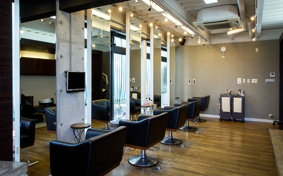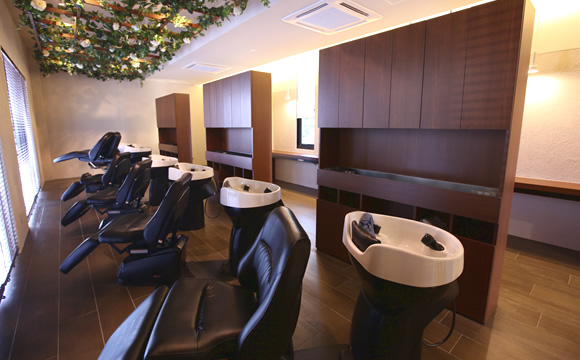 レディースフロア、メンズフロア、シャンプーブース、SPAブースがあり広々とした開放的な空間のサロンです。